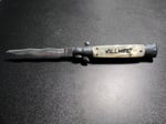 White handle, black logo and silver hardware, these Italian stilettos are sharp!